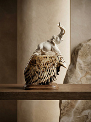 Бивень мамонта, используемый в качестве основы для скульптуры, придает ей особую ценность и уникальность. Его природные узоры и оттенки создают ощущение древности и магического очарования, идеально дополняя атмосферу сказочного сюжета. Каждая деталь скульптуры выполнена с исключительным мастерством и вниманием к мелочам. Тщательная резьба по кости позволяет передать фактуру шерсти, складки одежды и выражение лиц персонажей. Полированная поверхность материала отражает свет, придавая скульптуре дополнительную глубину и выразительность.
